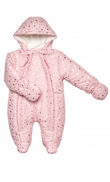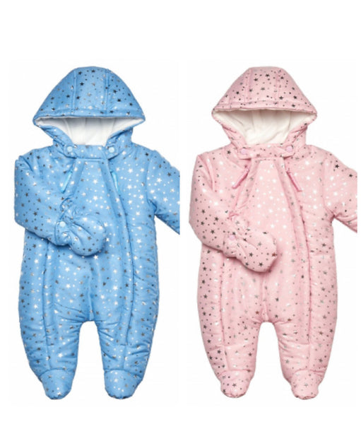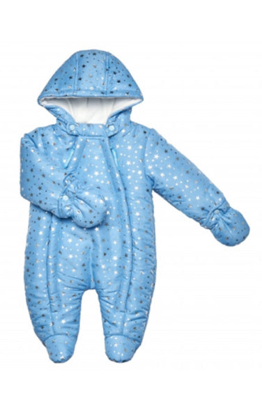 Silver star snowsuits , quilted in the inside , mits come off with buttons.